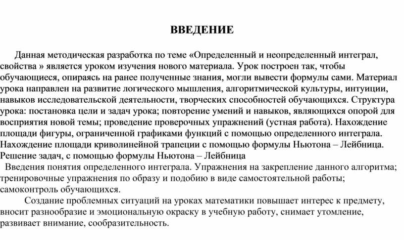 Данная методическая разработка по теме «Определенный и неопределенный интеграл, свойства » является уроком изучения нового материала. Урок построен так, чтобы обучающиеся, опираясь на ранее полученные знания, могли вывести формулы сами. Материал урока направлен на развитие логического мышления, алгоритмической культуры, интуиции, навыков исследовательской деятельности, творческих способностей обучающихся. Структура урока: постановка цели и задач урока; повторение умений и навыков, являющихся опорой для восприятия новой темы; проведение проверочных упражнений (устная работа). Нахождение площади фигуры, ограниченной графиками функций с помощью определенного интеграла. Нахождение площади криволинейной трапеции с помощью формулы Ньютона – Лейбница. Решение задач, с помощью формулы Ньютона – Лейбница