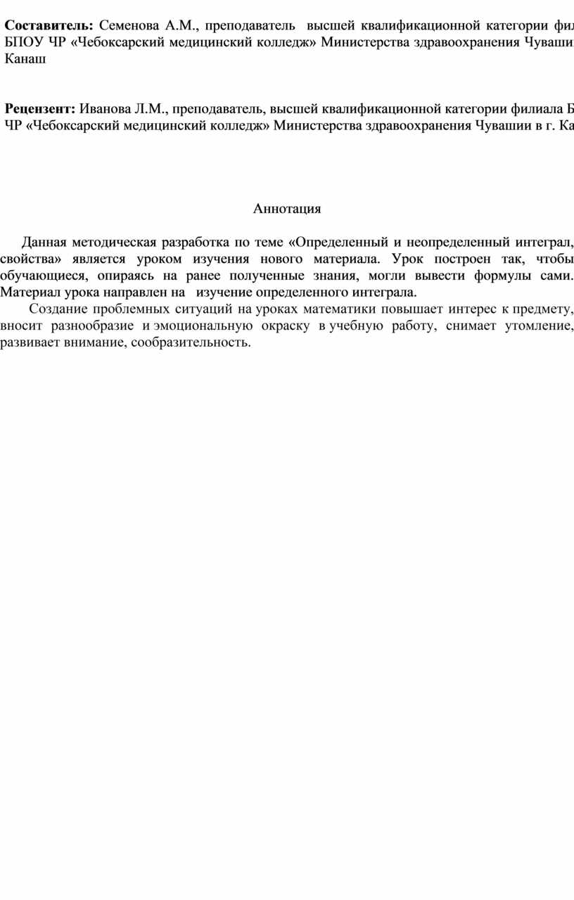 Рецензент: Иванова Л.М., преподаватель, высшей квалификационной категории филиала БПОУ ЧР «Чебоксарский медицинский колледж» Министерства здравоохранения Чувашии в г. Канаш