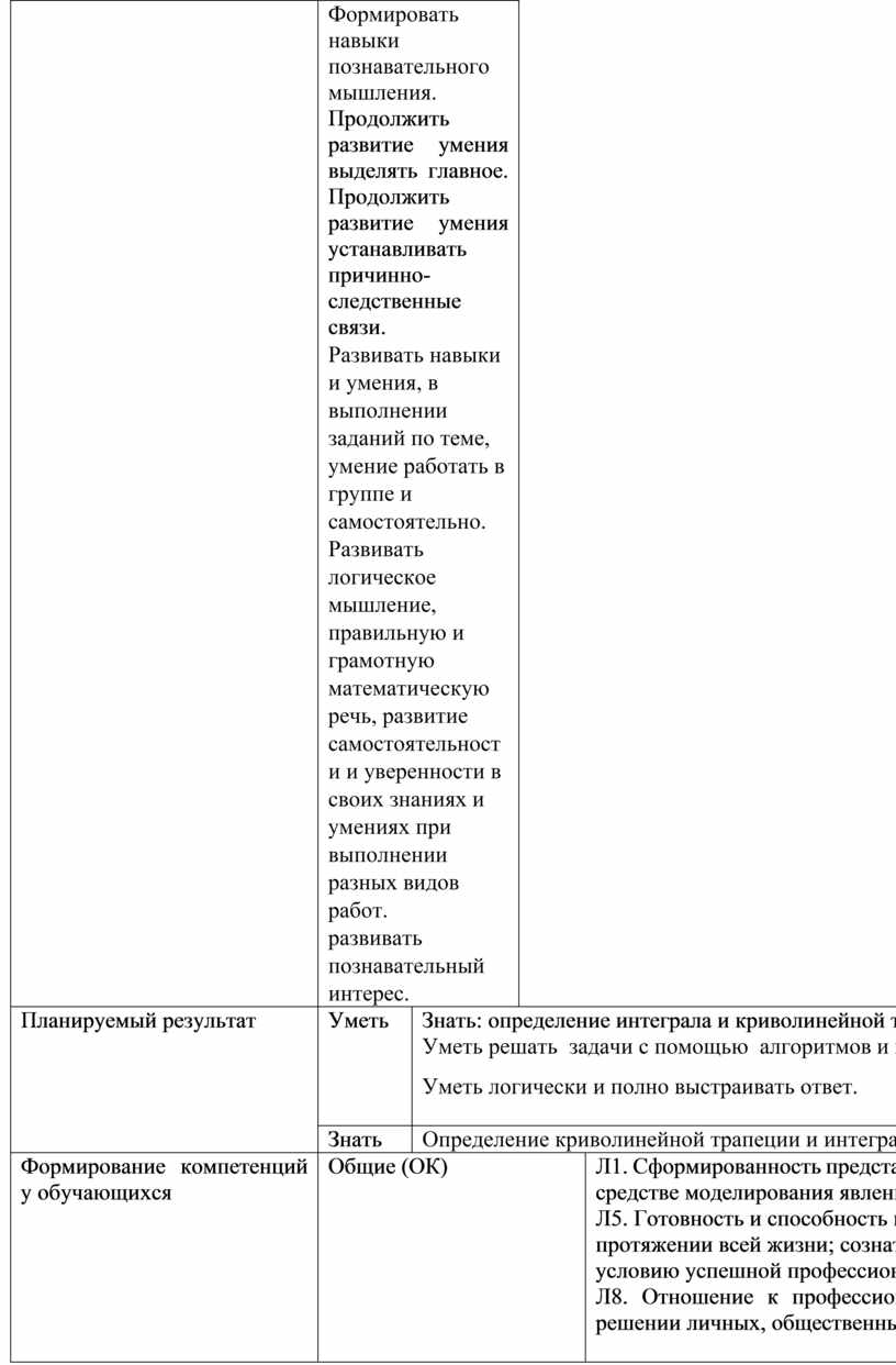 Знать: определение интеграла и криволинейной трапеции. Уметь решать задачи с помощью алгоритмов и методов; Уметь логически и полно выстраивать ответ. |