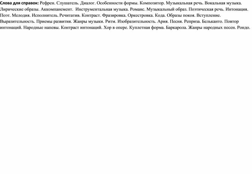 Слова для справок: Рефрен. Слушатель. Диалог. Особенности формы. Композитор. Музыкальная речь. Вокальная музыка. Лирические образы. Аккомпанемент. Инструментальная музыка. Романс. Музыкальный образ. Поэтическая речь. Интонация. Поэт. Мелодия. Исполнитель. Речитатив. Контраст. Фразировка. Оркестровка. Кода. Образы покоя. Вступление. Выразительность. Приемы развития. Жанры музыки. Ритм. Изобразительность. Ария. Песня. Реприза. Бельканто. Повтор интонаций. Народные напевы. Контраст интонаций. Хор в опере. Куплетная форма. Баркарола. Жанры народных песен. Рондо.