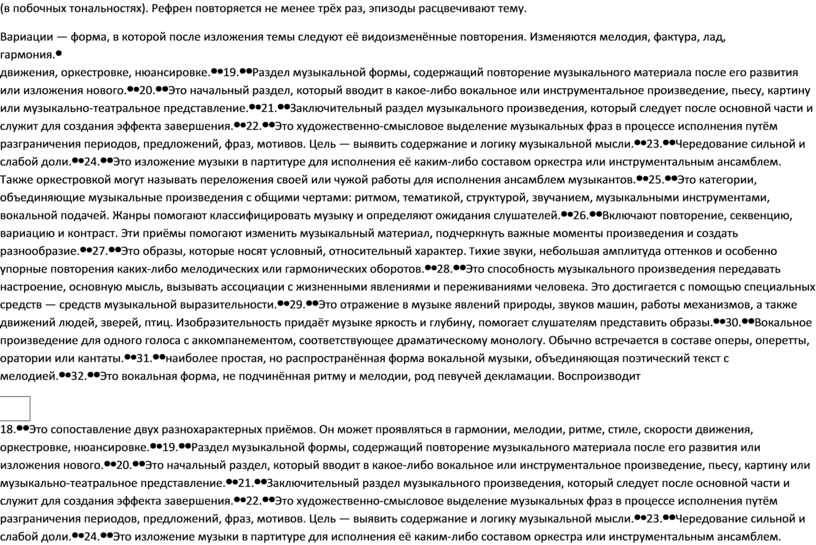 Включают повторение, секвенцию, вариацию и контраст. Эти приёмы помогают изменить музыкальный материал, подчеркнуть важные моменты произведения и создать разнообразие. |