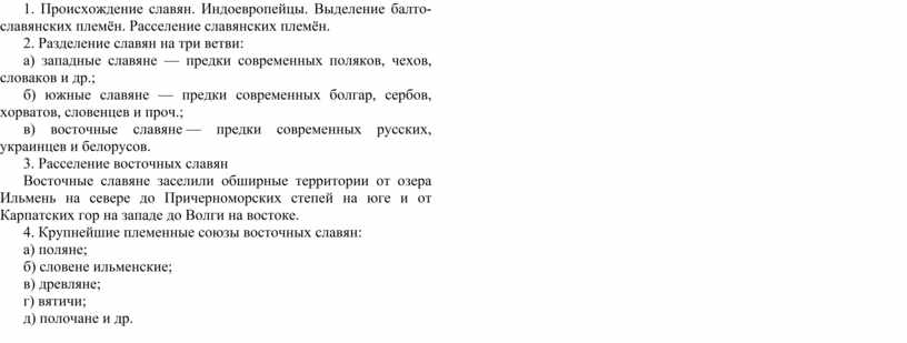25. Вам поручено подготовить развёрнутый ответ по теме «Происхождение и расселение восточных славян». Составьте план, в соответствии с которым Вы будете освещать эту тему. План должен содержать не менее трёх пунктов. Напишите краткое пояснение содержания любых двух пунктов. План с пояснениями должен отразить основные события (явления), связанные с происхождением и расселением восточнославянских племён.