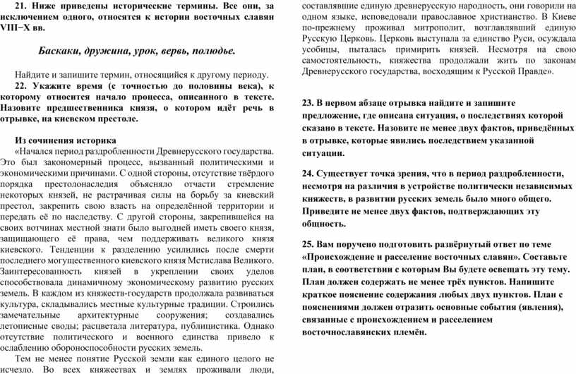 21. Ниже приведены исторические термины. Все они, за исключением одного, относятся к истории восточных славян VIII−X вв.