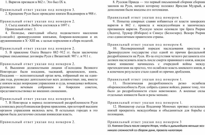 13. Княгиня Ольга после смерти Игоря, чтобы в дальнейшем меньше возникало сложностей со сбором дани, провела налоговую реформу, упорядочив сбор дани, введя уроки (точный размер дани) и погосты (место их сбора).