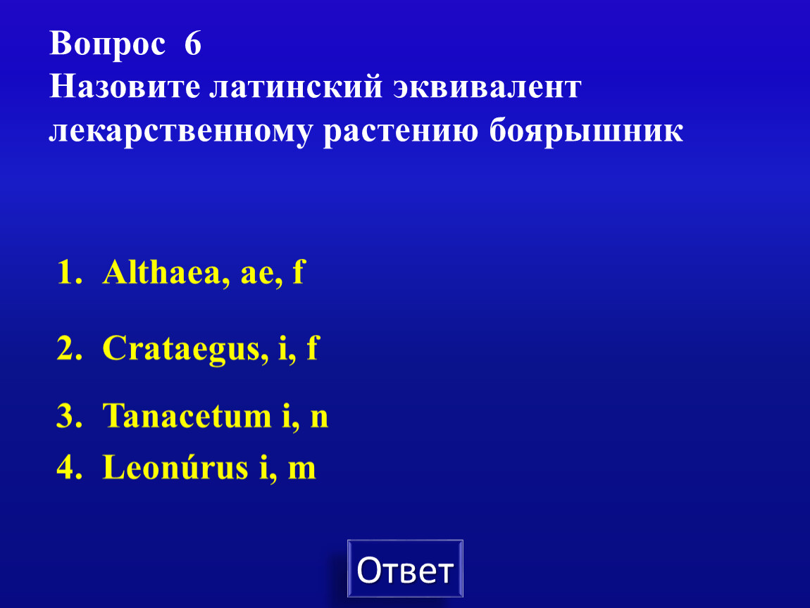 Вопрос 6 Назовите латинский эквивалент лекарственному растению боярышник