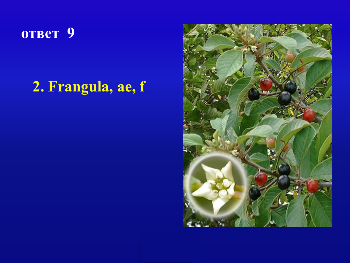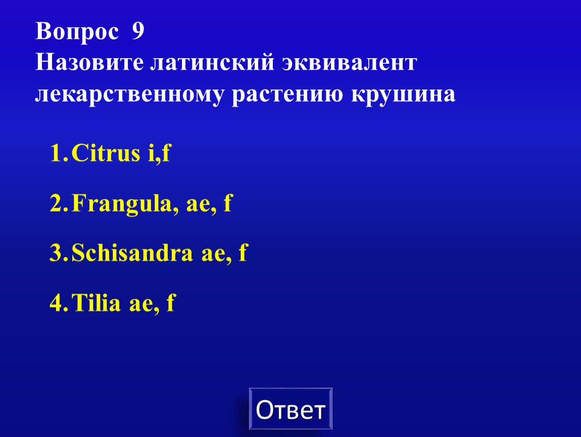 Вопрос 9Назовите латинский эквивалент лекарственному растению крушина