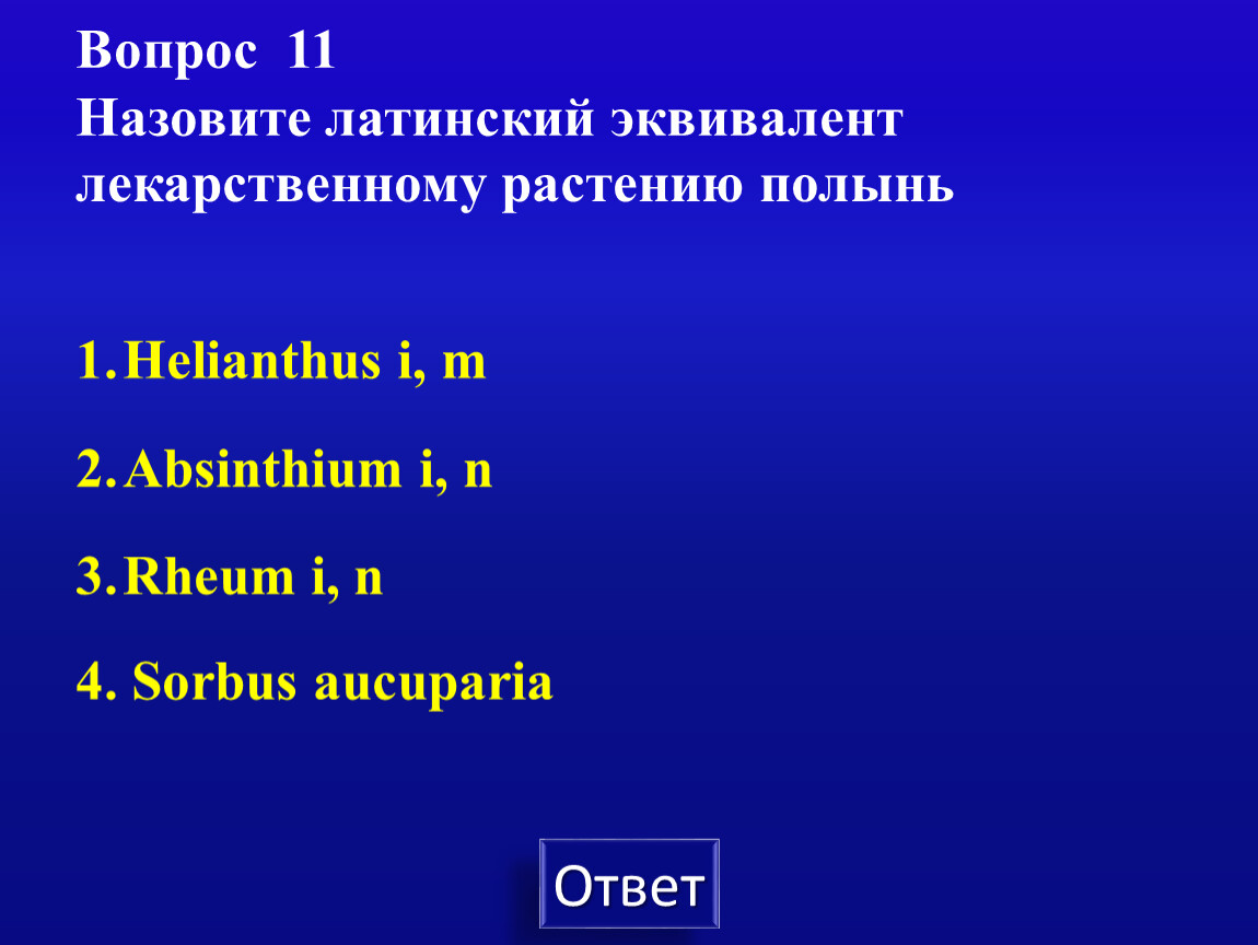 Вопрос 11Назовите латинский эквивалент лекарственному растению полынь