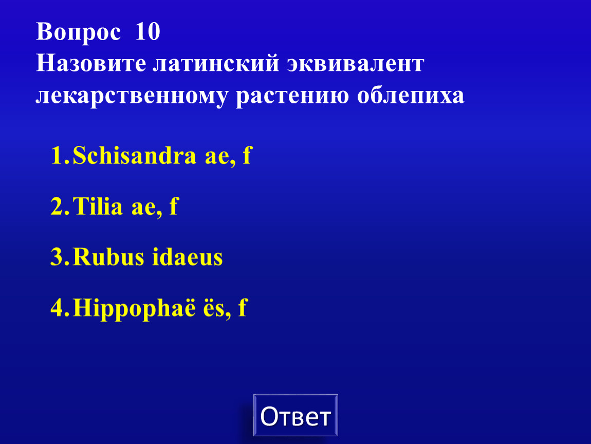 Вопрос 10Назовите латинский эквивалент лекарственному растению облепиха