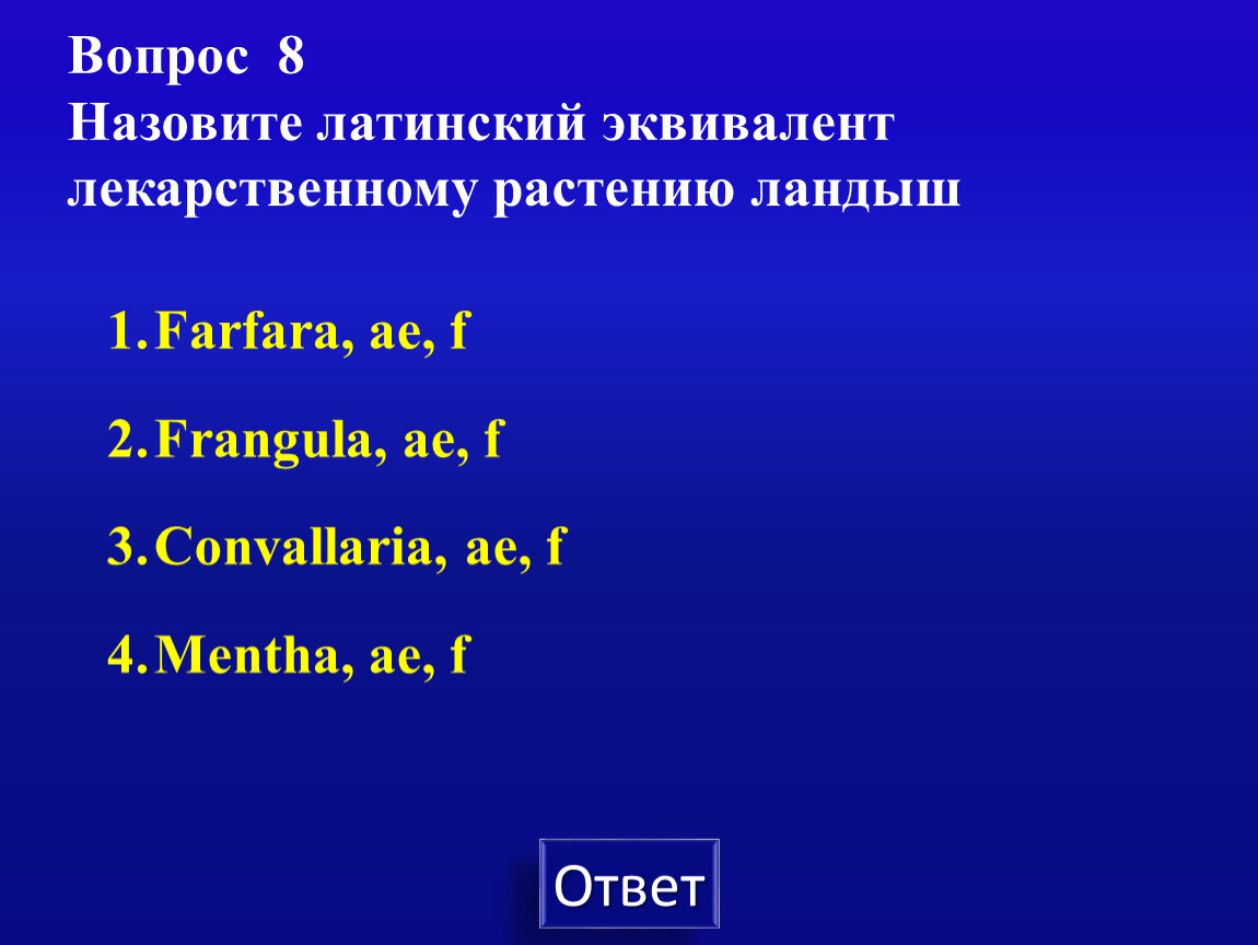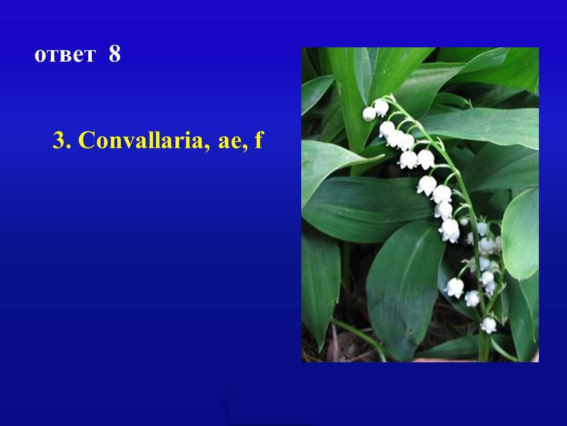 Вопрос 8Назовите латинский эквивалент лекарственному растению ландыш