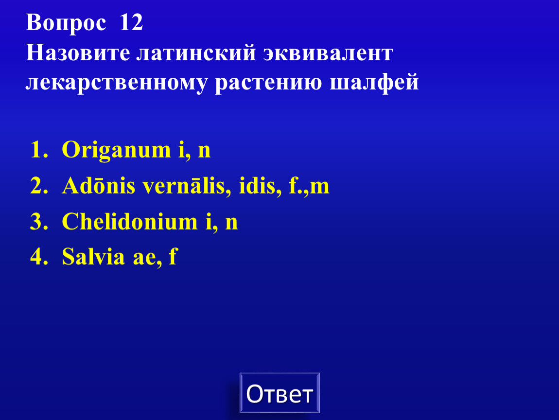 Вопрос 12Назовите латинский эквивалент лекарственному растению шалфей