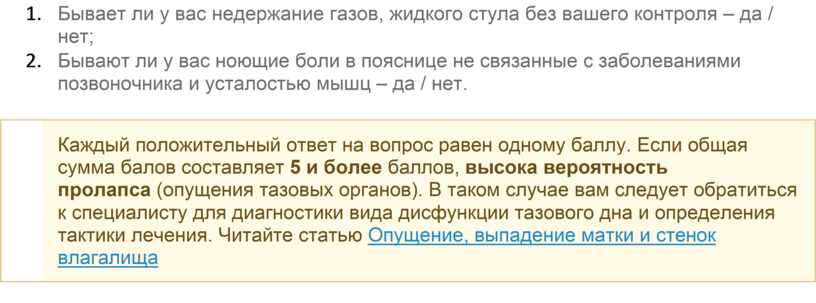 Каждый положительный ответ на вопрос равен одному баллу. Если общая сумма балов составляет 5 и более баллов, высока вероятность пролапса (опущения тазовых органов). В таком случае вам следует обратиться к специалисту для диагностики вида дисфункции тазового дна и определения тактики лечения. Читайте статью Опущение, выпадение матки и стенок влагалища