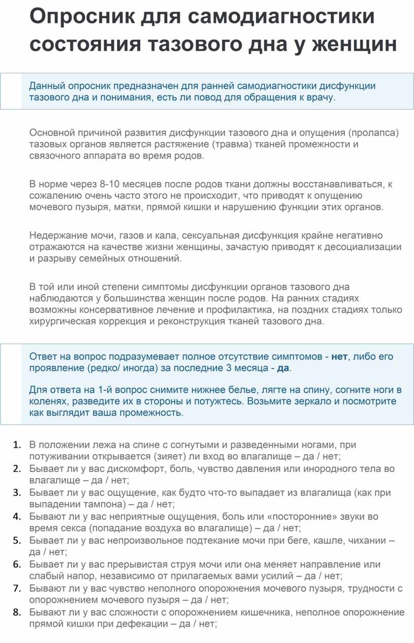 Данный опросник предназначен для ранней самодиагностики дисфункции тазового дна и понимания, есть ли повод для обращения к врачу.