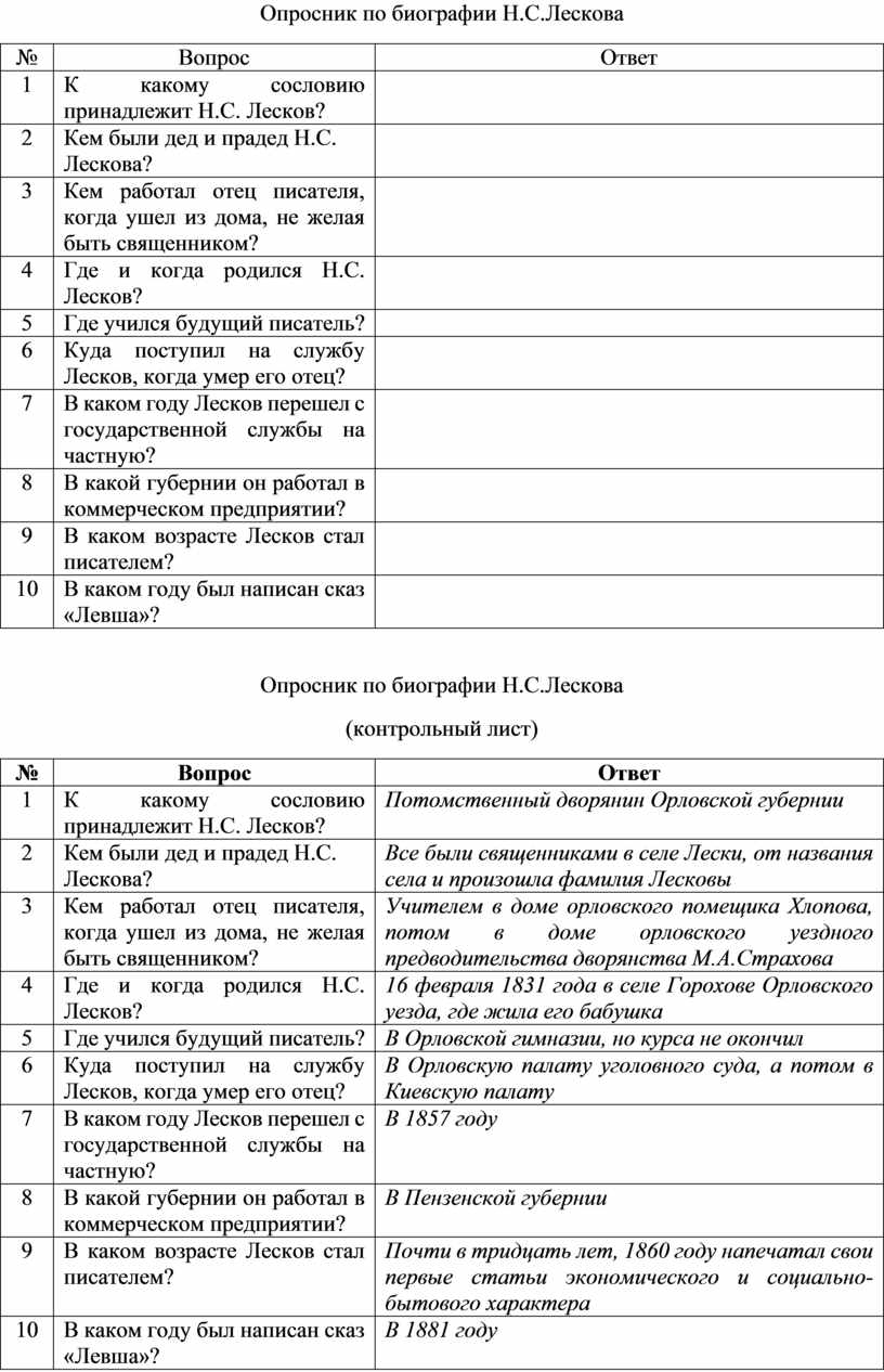 Опросник по биографии Н.С.Лескова