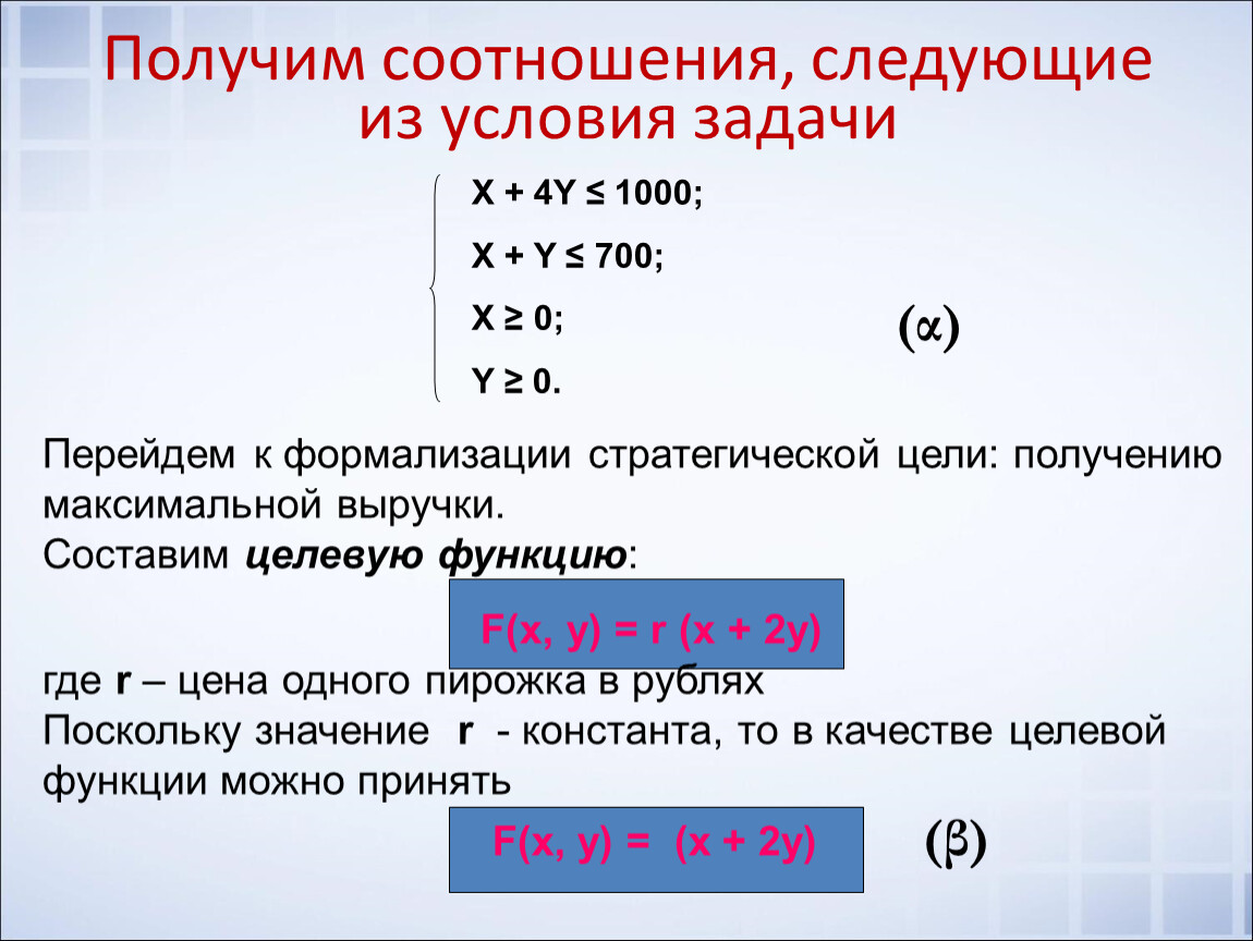 А поскольку в целевую функцию f (x,y) величины X и Y входят линейно (то есть в первой степени), то наша задача относится к разделу этой науки, который называется линейным программированием.