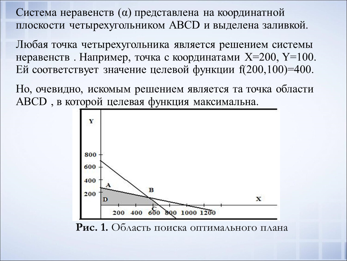 Любая точка четырехугольника является решением системы неравенств . Например, точка с координатами Х=200, Y=100. Ей соответствует значение целевой функции f(200,100)=400.