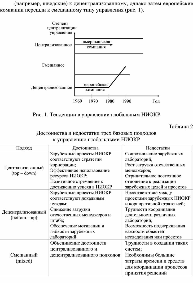 В конце 70-х годов американские компании склонялись к централизованному подходу в организации своих глобальных НИОКР, а европейские компании (например, шведские) к децентрализованному, однако затем европейские компании перешли к смешанному типу управления (рис. 1).