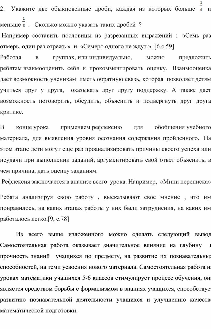Из всего выше изложенного можно сделать следующий вывод. Самостоятельная работа оказывает значительное влияние на глубину и прочность знаний учащихся по предмету, на развитие их познавательных способностей, на темп усвоения нового материала. Самостоятельная работа на уроках математики учащихся 5-6 классов стимулирует процесс обучения, она является средством борьбы с формализмом в знаниях учащихся, способствует развитию познавательной деятельности учащихся и улучшению качества математической подготовки.