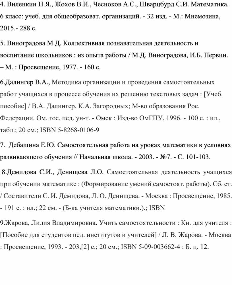 8.Демидова С.И., Денищева Л.О. Самостоятельная деятельность учащихся при обучении математике : (Формирование умений самостоят. работы). Сб. ст. / Составители С. И. Демидова, Л. О. Денищева. - Москва : Просвещение, 1985. - 191 с. : ил.; 22 см. - (Б-ка учителя математики.).; ISBN