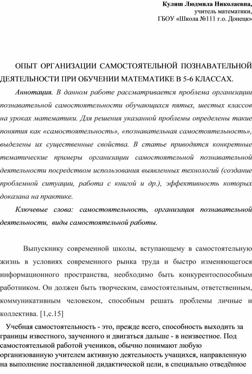 ОПЫТ ОРГАНИЗАЦИИ САМОСТОЯТЕЛЬНОЙ ПОЗНАВАТЕЛЬНОЙ ДЕЯТЕЛЬНОСТИ ПРИ ОБУЧЕНИИ МАТЕМАТИКЕ В 5-6 КЛАССАХ.