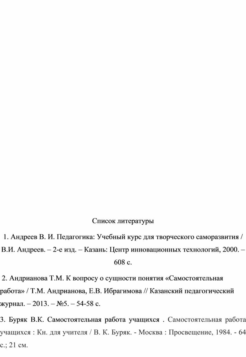 2. Андрианова Т.М. К вопросу о сущности понятия «Самостоятельная работа» / Т.М. Андрианова, Е.В. Ибрагимова // Казанский педагогический журнал. – 2013. – №5. – 54-58 с.