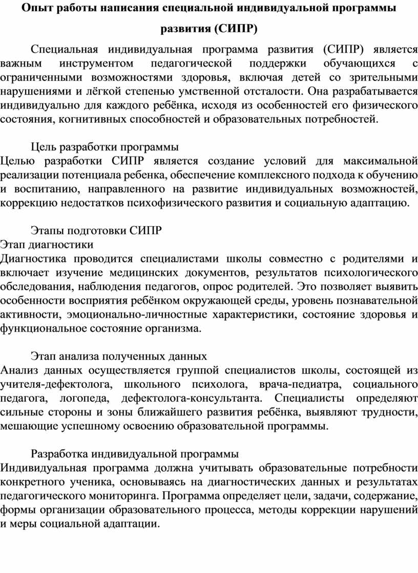 Специальная индивидуальная программа развития (СИПР) является важным инструментом педагогической поддержки обучающихся с ограниченными возможностями здоровья, включая детей со зрительными нарушениями и лёгкой степенью умственной отсталости. Она разрабатывается индивидуально для каждого ребёнка, исходя из особенностей его физического состояния, когнитивных способностей и образовательных потребностей.