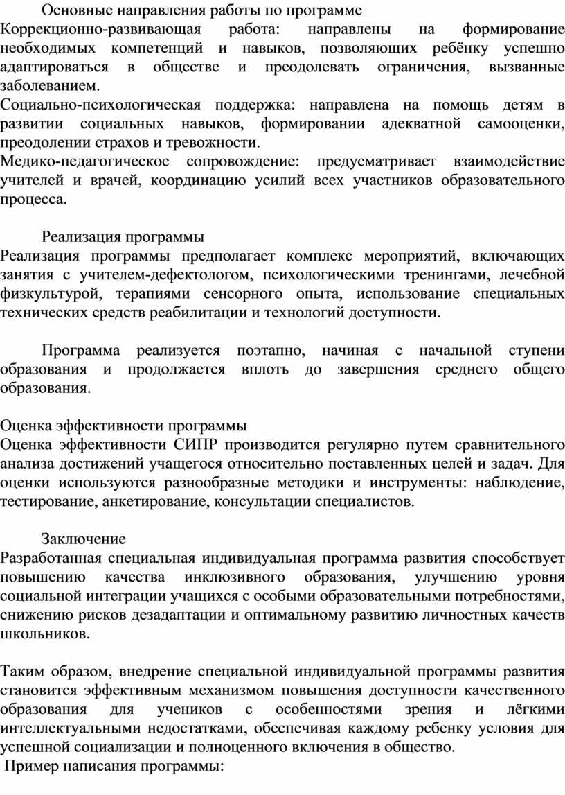 Таким образом, внедрение специальной индивидуальной программы развития становится эффективным механизмом повышения доступности качественного образования для учеников с особенностями зрения и лёгкими интеллектуальными недостатками, обеспечивая каждому ребенку условия для успешной социализации и полноценного включения в общество.
