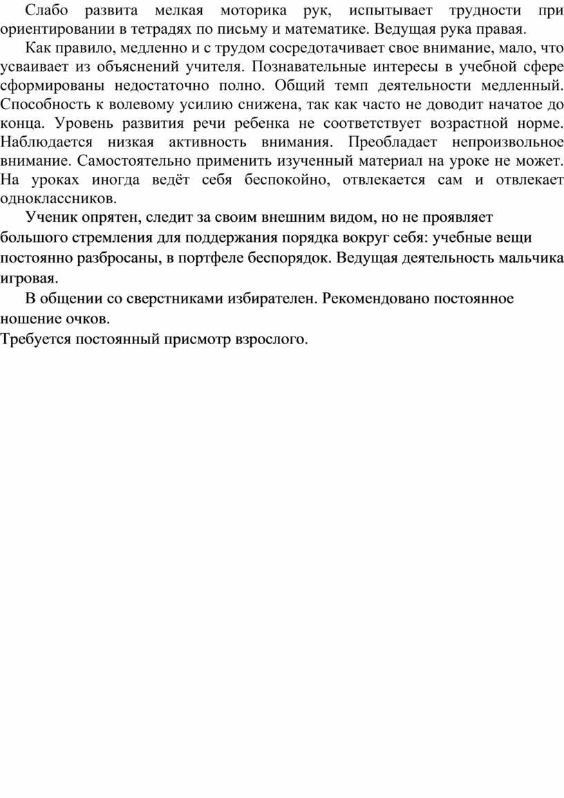 Как правило, медленно и с трудом сосредотачивает свое внимание, мало, что усваивает из объяснений учителя. Познавательные интересы в учебной сфере сформированы недостаточно полно. Общий темп деятельности медленный. Способность к волевому усилию снижена, так как часто не доводит начатое до конца. Уровень развития речи ребенка не соответствует возрастной норме. Наблюдается низкая активность внимания. Преобладает непроизвольное внимание. Самостоятельно применить изученный материал на уроке не может. На уроках иногда ведёт себя беспокойно, отвлекается сам и отвлекает одноклассников.