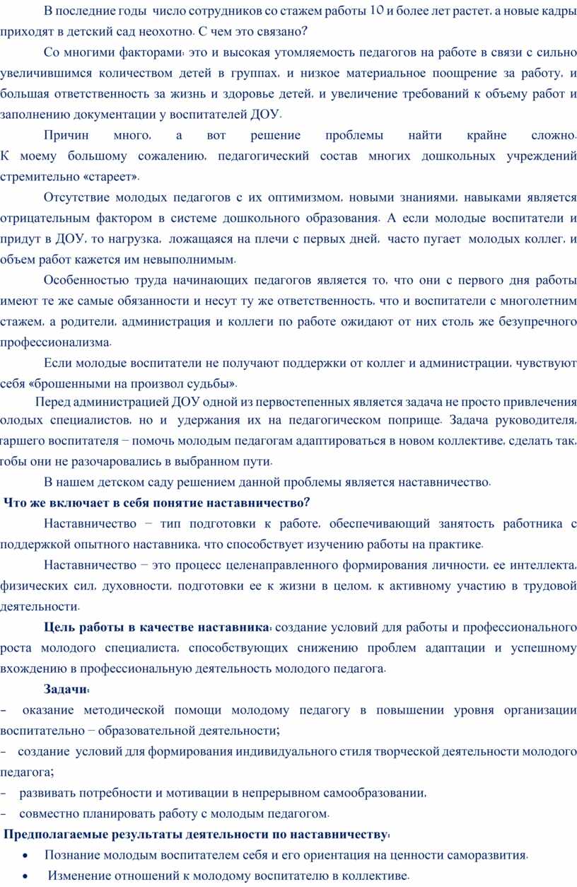 деятельность наставника, с другой – деятельность молодого педагога. Этот процесс носит субъект-субъектный характер и является одной из разновидностей педагогического взаимодействия. Даная форма работы с молодыми специалистами оказывает положительное влияние на всех участников отношений, а также самой образовательной организации. Организация, таким образом, повышает культурный и профессиональный уровень подготовки кадров; улучшаются взаимоотношения между сотрудниками.