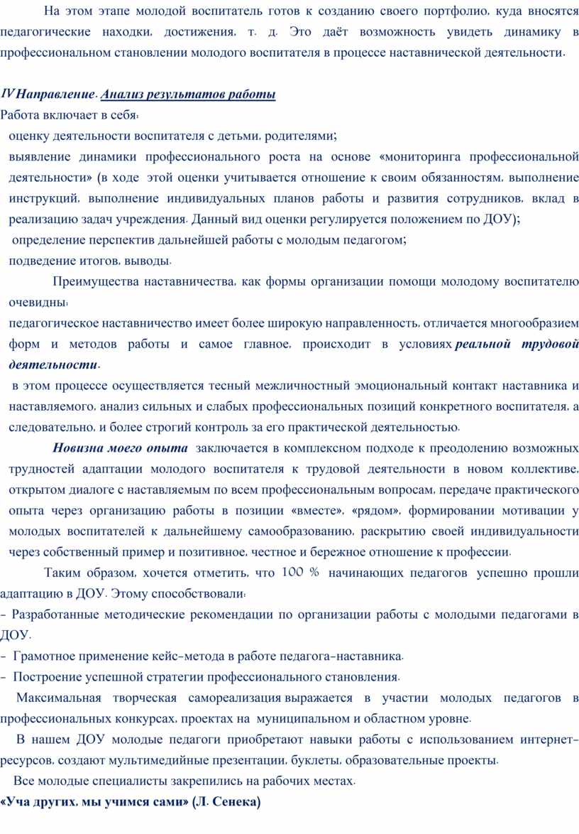 На этом этапе молодой воспитатель готов к созданию своего портфолио, куда вносятся педагогические находки, достижения, т. д. Это даёт возможность увидеть динамику в профессиональном становлении молодого воспитателя в процессе наставнической деятельности.