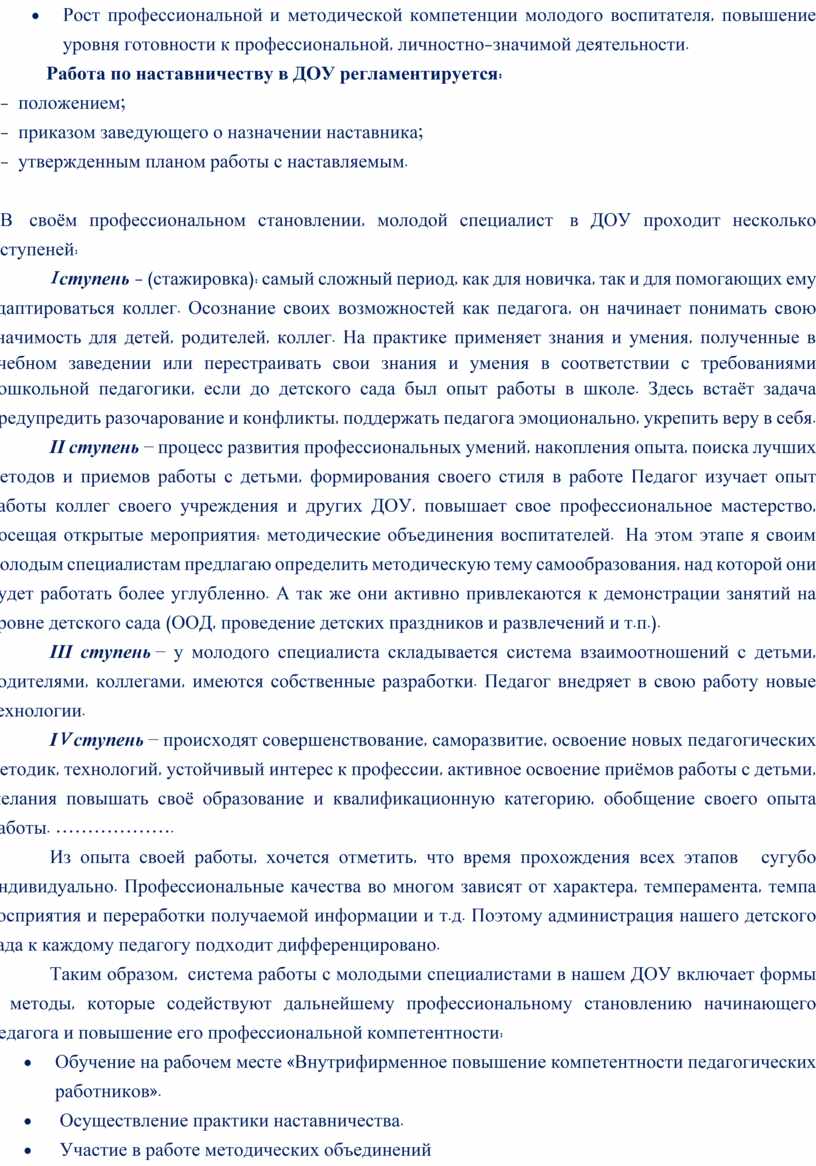 В своём профессиональном становлении, молодой специалист в ДОУ проходит несколько ступеней:
