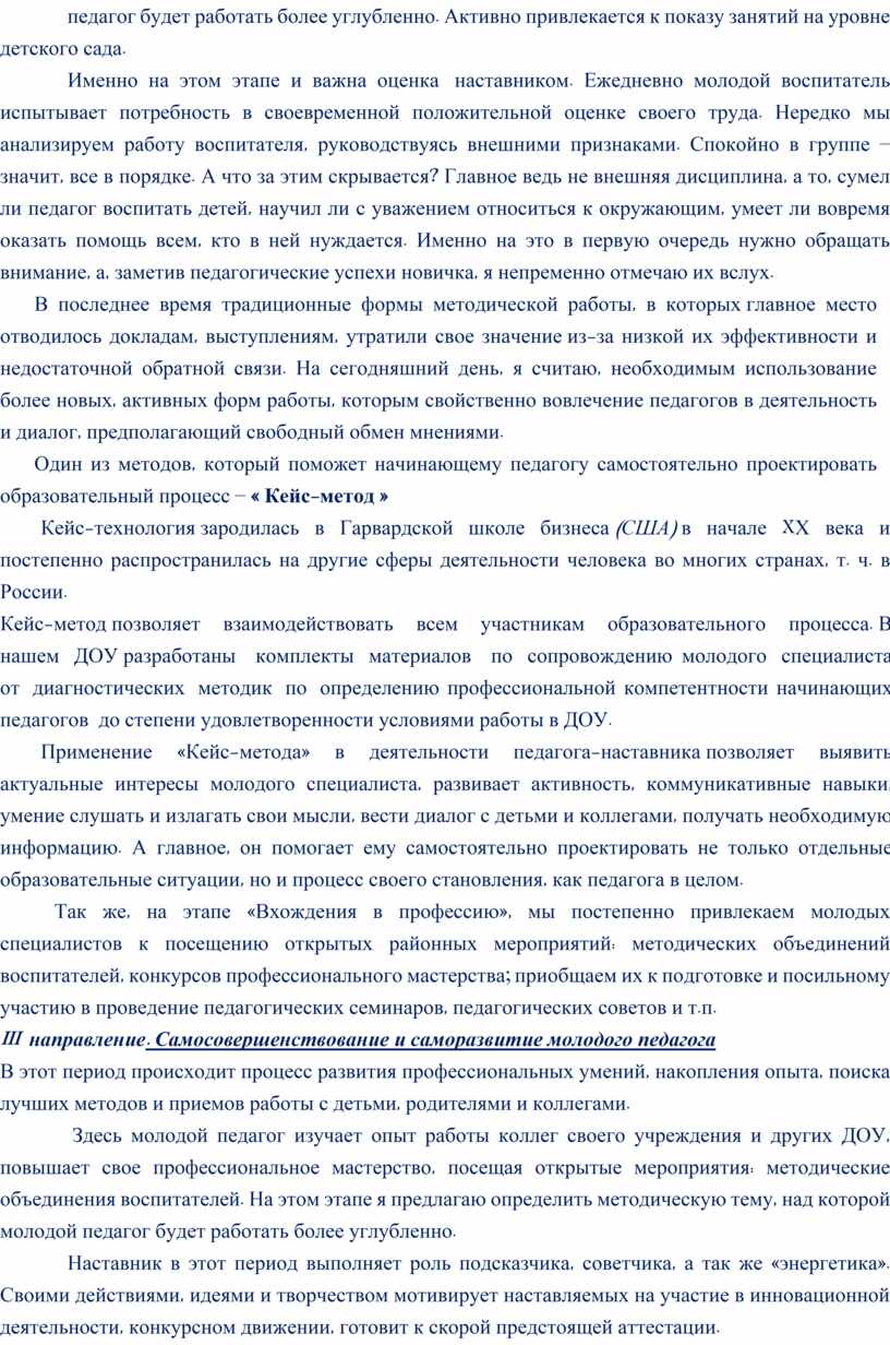 Применение «Кейс-метода» в деятельности педагога-наставника позволяет выявить актуальные интересы молодого специалиста, развивает активность, коммуникативные навыки, умение слушать и излагать свои мысли, вести диалог с детьми и коллегами, получать необходимую информацию. А главное, он помогает ему самостоятельно проектировать не только отдельные образовательные ситуации, но и процесс своего становления, как педагога в целом.