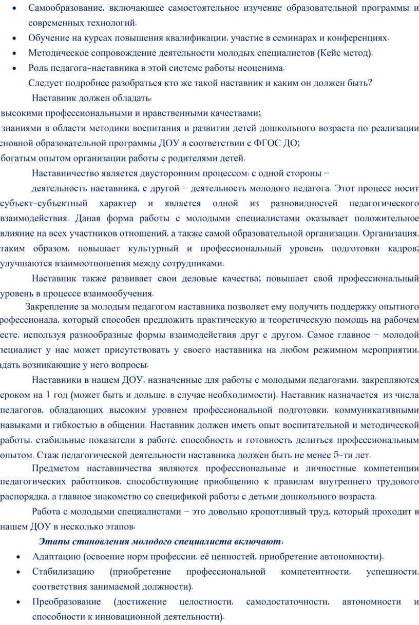 Этапы становления молодого специалиста включают: