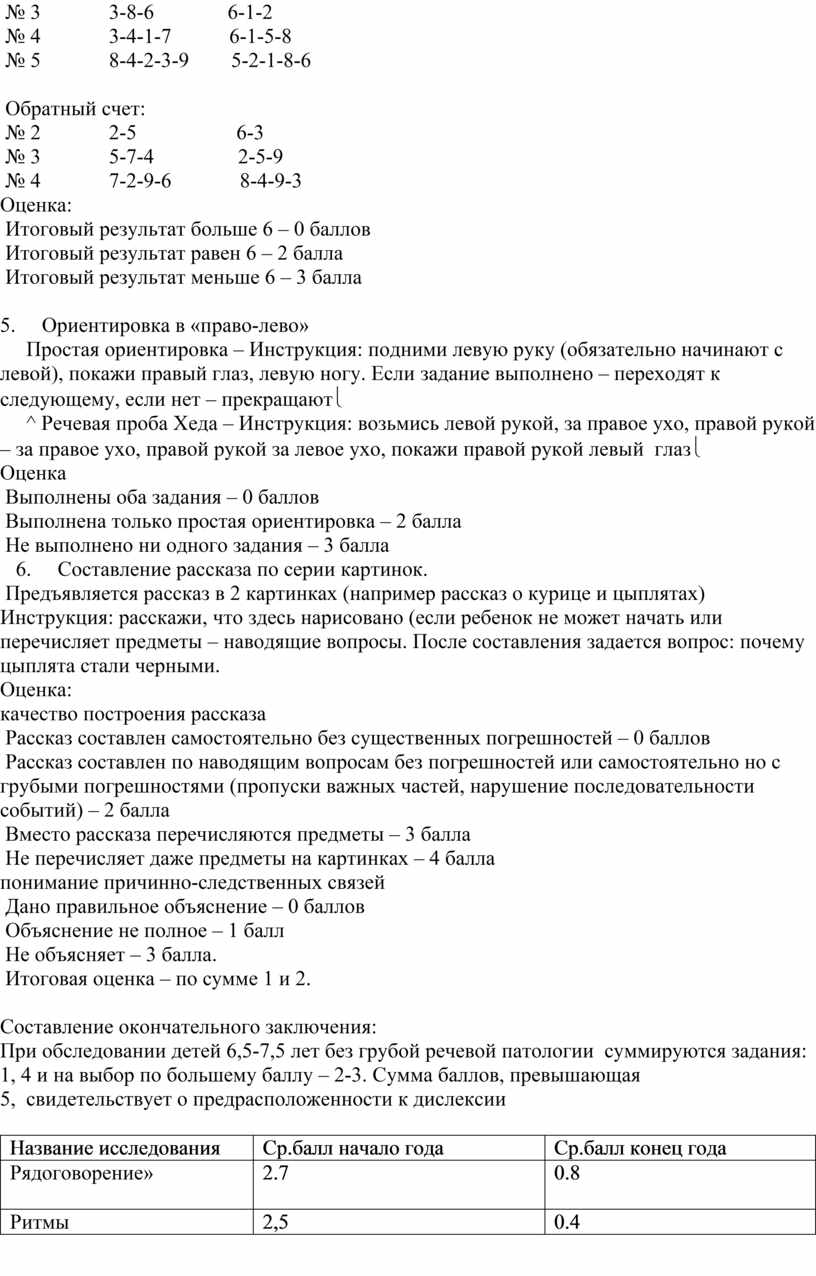 При обследовании детей 6,5-7,5 лет без грубой речевой патологии суммируются задания: 1, 4 и на выбор по большему баллу – 2-3. Сумма баллов, превышающая 5, свидетельствует о предрасположенности к дислексии