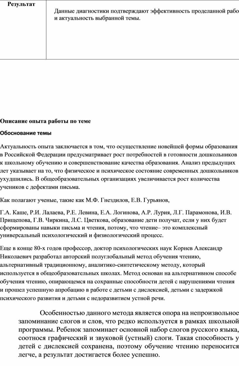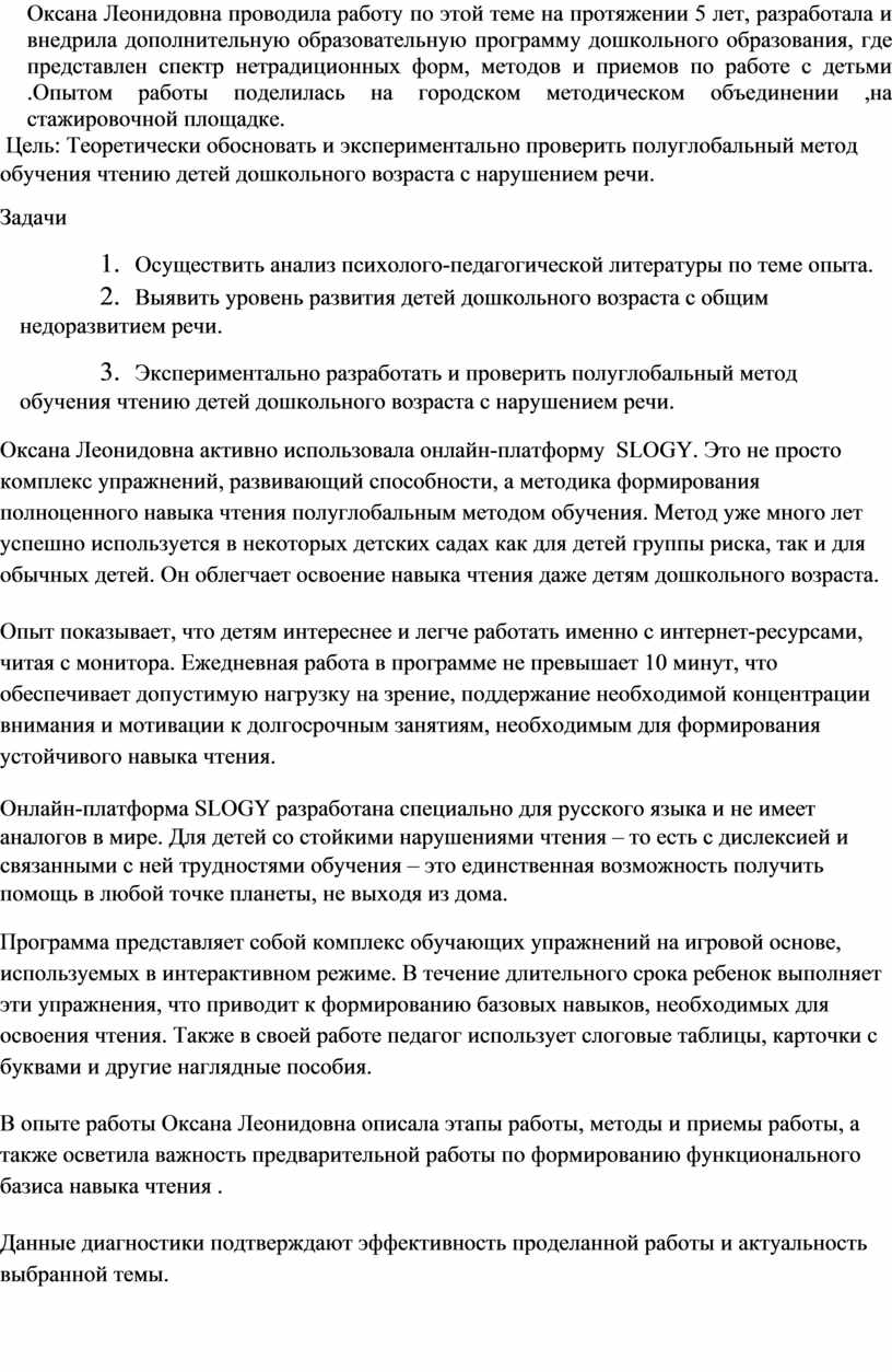 Опыт работы Оксаны Леонидовны посвящён актуальной теме обучение чтению детей дошкольного возраста с речевыми нарушениями с использованием полуглобального метода, разработанного Корневым А.Н.