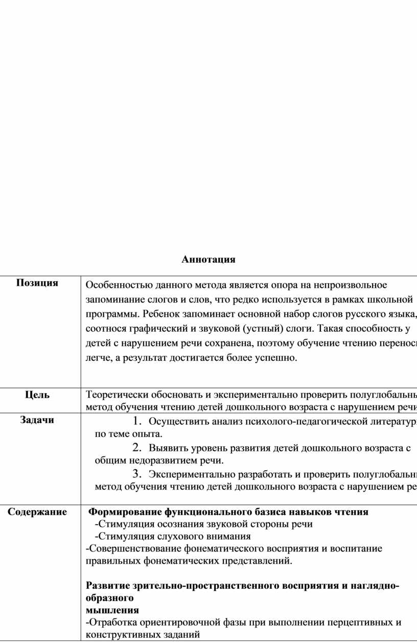 Цель: Теоретически обосновать и экспериментально проверить полуглобальный метод обучения чтению детей дошкольного возраста с нарушением речи.