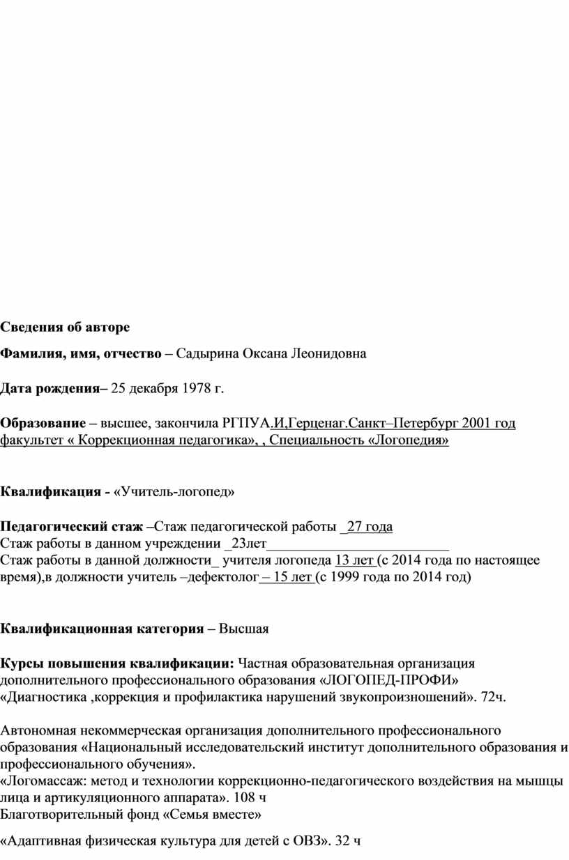 автор: Садырина Оксана Леонидовна учитель-логопед муниципального бюджетного