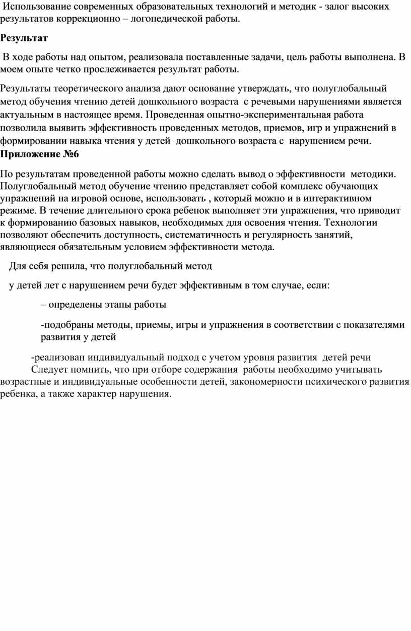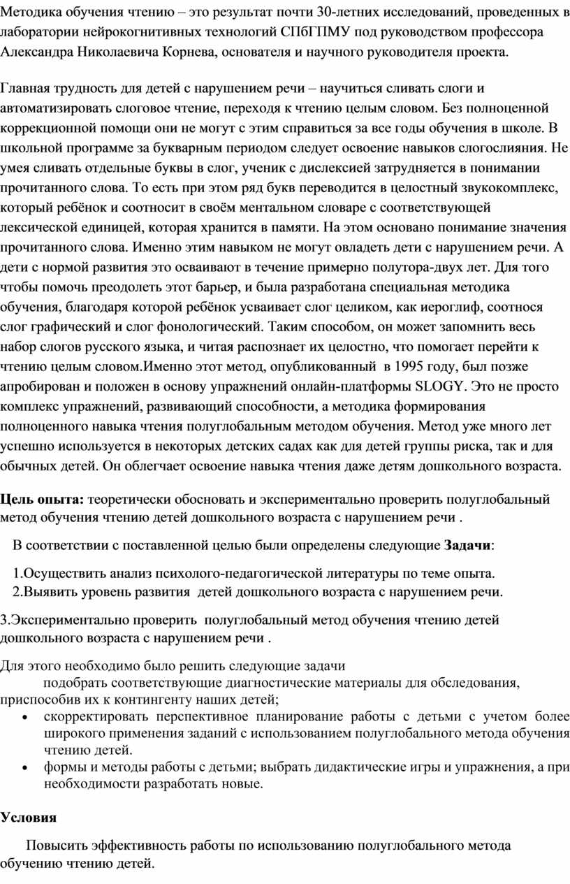Цель опыта: теоретически обосновать и экспериментально проверить полуглобальный метод обучения чтению детей дошкольного возраста с нарушением речи .