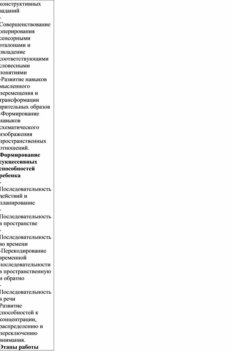 Развитие зрительно-пространственного восприятия и наглядно-образного мышления -Отработка ориентировочной фазы при выполнении перцептивных и конструктивных заданий -Совершенствование оперирования сенсорными эталонами и овладение соответствующими словесными понятиями -Развитие навыков мысленного перемещения и трансформации зрительных образов -Формирование навыков схематического изображения пространственных отношений. Формирование сукцессивных способностей ребенка -Последовательность действий и планирование -Последовательность в пространстве -Последовательность во времени -Перекодирование временной последовательности в пространственную и обратно -Последовательность в речи Развитие способностей к концентрации, распределению и переключению внимания. Этапы работы Упрочение звуко-буквенных связей 1 Формирование стабильного графического образа буквы 2 Группировка стилизованных букв Автоматизация слогослияния 1 Использование слогового материала 2 Использование слов, состоящих из слогов, входящих в таблицу 3 Стимуляция понимания прочитанного и развития кратковременной словесной памяти. 4 Чтение текстов с учетом уровня сложности сформированных оперативных единиц чтения. 5 Использование приема чтения с «окошечком» Формирование понимания текста |