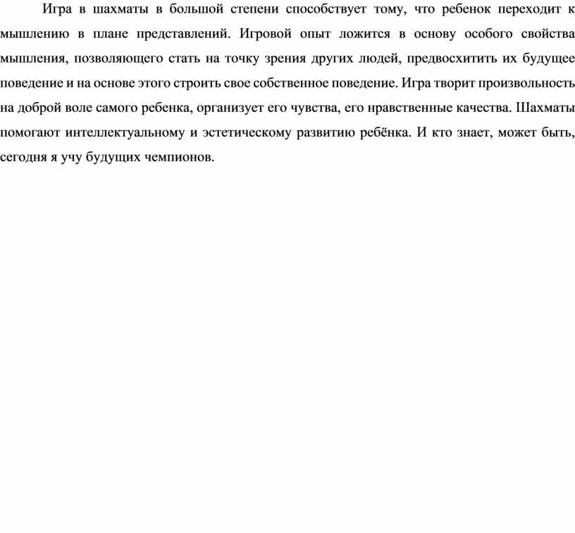 Игра в шахматы в большой степени способствует тому, что ребенок переходит к мышлению в плане представлений. Игровой опыт ложится в основу особого свойства мышления, позволяющего стать на точку зрения других людей, предвосхитить их будущее поведение и на основе этого строить свое собственное поведение. Игра творит произвольность на доброй воле самого ребенка, организует его чувства, его нравственные качества. Шахматы помогают интеллектуальному и эстетическому развитию ребёнка. И кто знает, может быть, сегодня я учу будущих чемпионов.