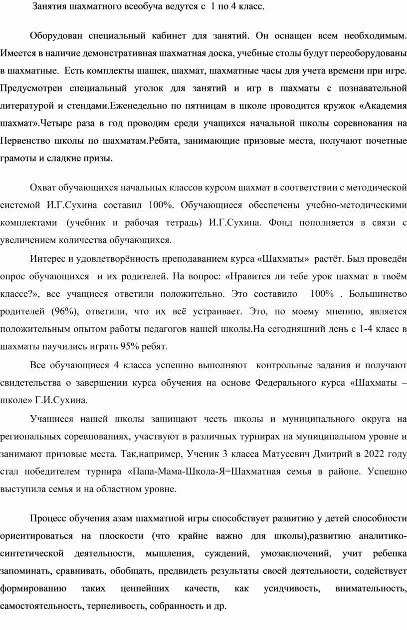 Оборудован специальный кабинет для занятий. Он оснащен всем необходимым. Имеется в наличие демонстративная шахматная доска, учебные столы будут переоборудованы в шахматные. Есть комплекты шашек, шахмат, шахматные часы для учета времени при игре. Предусмотрен специальный уголок для занятий и игр в шахматы с познавательной литературой и стендами.Еженедельно по пятницам в школе проводится кружок «Академия шахмат».Четыре раза в год проводим среди учащихся начальной школы соревнования на Первенство школы по шахматам.Ребята, занимающие призовые места, получают почетные грамоты и сладкие призы.
