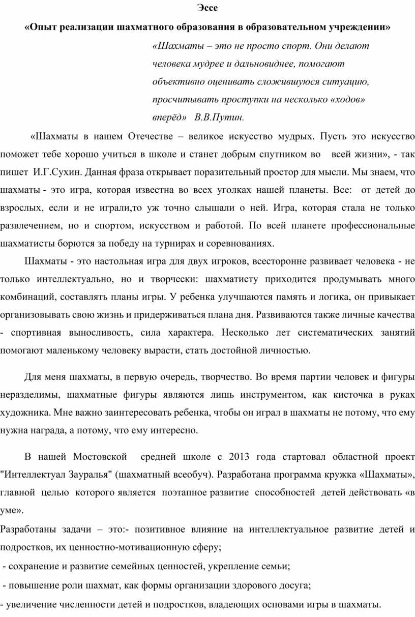 «Шахматы – это не просто спорт. Они делают человека мудрее и дальновиднее, помогают объективно оценивать сложившуюся ситуацию, просчитывать проступки на несколько «ходов» вперёд» В.В.Путин.