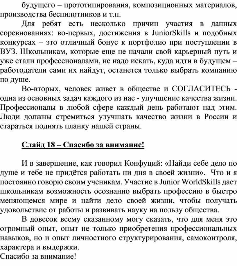 И в завершение, как говорил Конфуций: «Найди себе дело по душе и тебе не придётся работать ни дня в своей жизни». Что и я постоянно говорю своим ученикам. Участие в Junior WorldSkills дает школьникам возможность осознанно выбрать профессию в быстро меняющемся мире и найти дело своей жизни, чтобы получать удовольствие от работы и развивать науку на пользу общества.