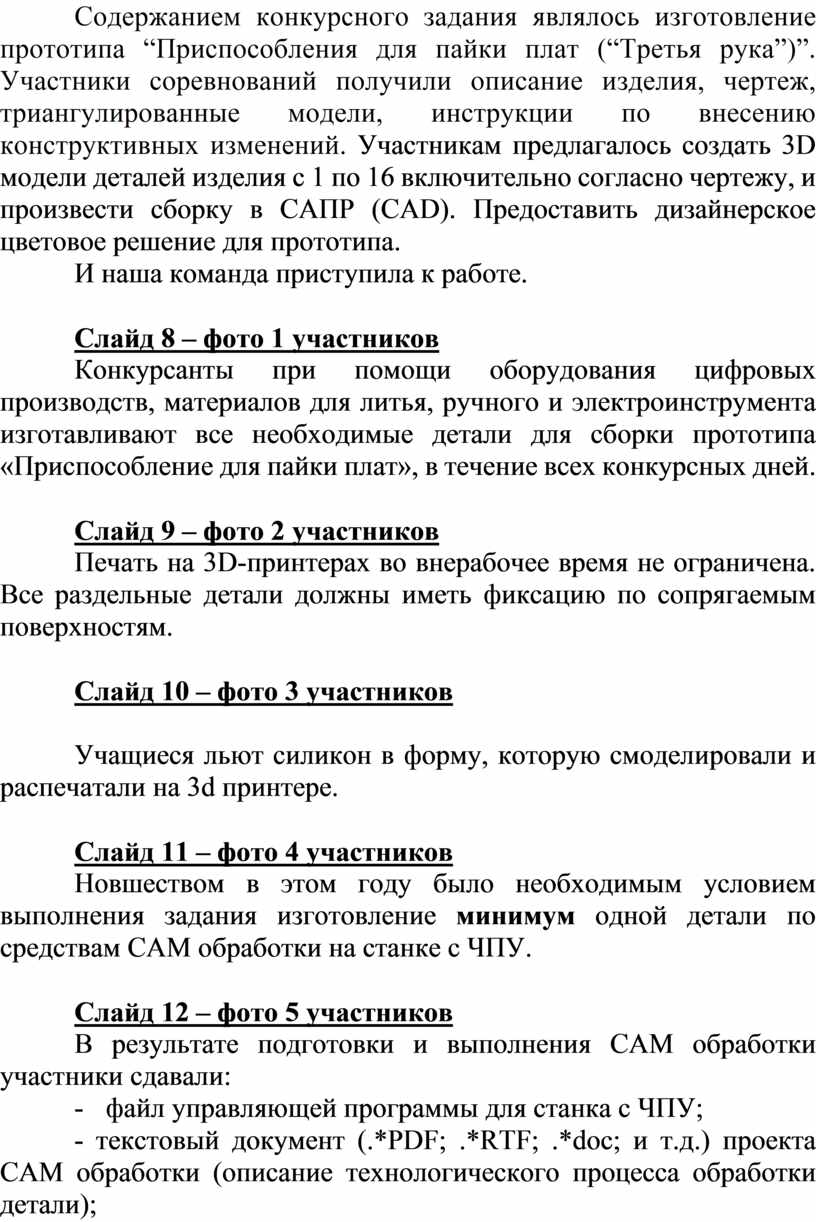 Конкурсанты при помощи оборудования цифровых производств, материалов для литья, ручного и электроинструмента изготавливают все необходимые детали для сборки прототипа «Приспособление для пайки плат», в течение всех конкурсных дней.