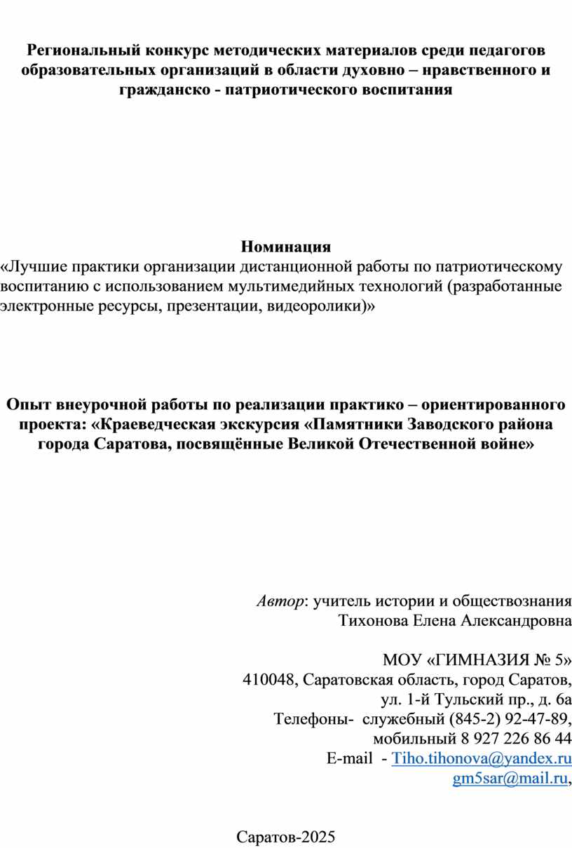 Опыт внеурочной работы по реализации практико – ориентированного проекта: «Краеведческая экскурсия «Памятники Заводского района города Саратова, посвящённые Великой Отечественной войне»