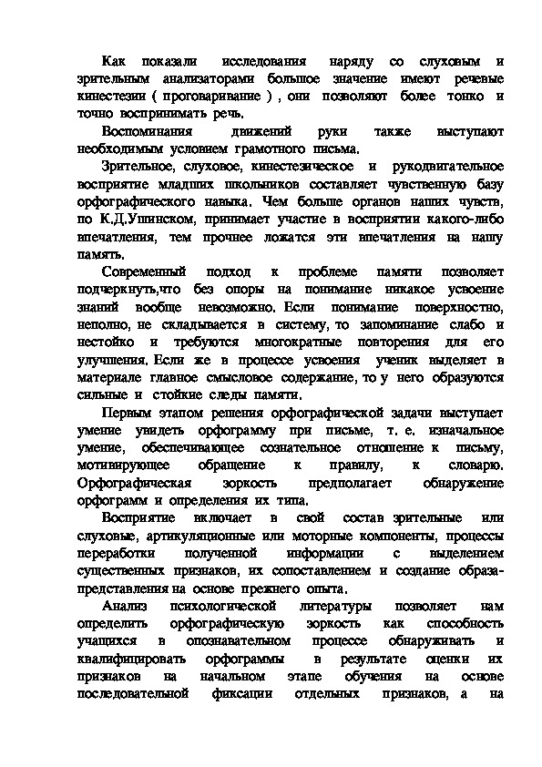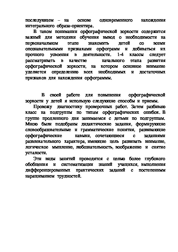Как известно, орфографическая грамотность должна закладываться в младших классах. Однако во время обучения в 1-4 классах у большей части детей она не формируется. Лингвисты, психологи, методисты подчеркивают зависимость результатов обучения орфографии от его первоначального этапа, от того, насколько развита у учащихся способность, обнаруживать в словах места, которые нужно писать по правилам. Значит задача учителя - формировать орфографическую зоркость учащихся.
