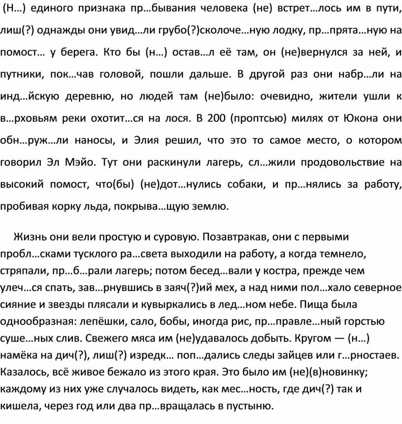 (Н…) единого признака пр…бывания человека (не) встрет…лось им в пути, лиш(?) однажды они увид…ли грубо(?)сколоче…ную лодку, пр…прята…ную на помост… у берега. Кто бы (н…) остав…л её там, он (не)вернулся за ней, и путники, пок…чав головой, пошли дальше. В другой раз они набр…ли на инд…йскую деревню, но людей там (не)было: очевидно, жители ушли к в…рховьям реки охотит…ся на лося. В 200 (проптсью) милях от Юкона они обн…руж…ли наносы, и Элия решил, что это то самое место, о котором говорил Эл Мэйо. Тут они раскинули лагерь, сл…жили продовольствие на высокий помост, что(бы) (не)дот…нулись собаки, и пр…нялись за работу, пробивая корку льда, покрыва…щую землю.