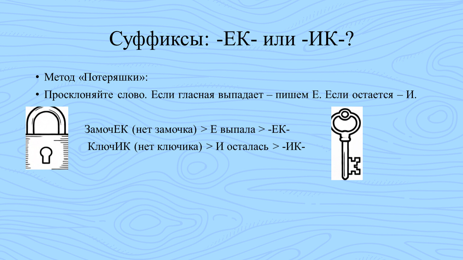 4. Поймем логику суффиксов -ЕК-/-ИК- и -ЧИК-/-ЩИК-.