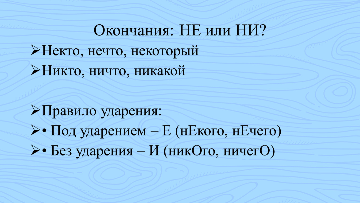 • Под ударением – Е (нЕкого, нЕчего)