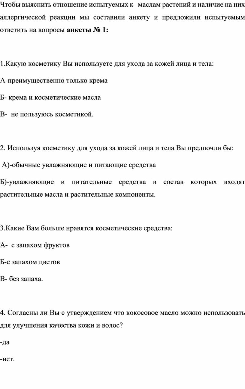 Чтобы выяснить отношение испытуемых к маслам растений и наличие на них аллергической реакции мы составили анкету и предложили испытуемым ответить на вопросы анкеты № 1: