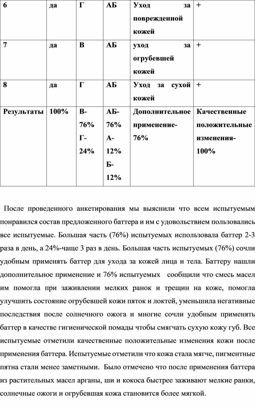 После проведенного анкетирования мы выяснили что всем испытуемым понравился состав предложенного баттера и им с удовольствием пользовались все испытуемые. Большая часть (76%) испытуемых использовала баттер 2-3 раза в день, а 24%-чаще 3 раз в день. Большая часть испытуемых (76%) сочли удобным применять баттер для ухода за кожей лица и тела. Баттеру нашли дополнительное применение и 76% испытуемых сообщили что смесь масел им помогла при заживлении мелких ранок и трещин на коже, помогла улучшить состояние огрубевшей кожи пяток и локтей, уменьшила негативные последствия после солнечного ожога и многие сочли удобным применять баттер в качестве гигиенической помады чтобы смягчать сухую кожу губ. Все испытуемые отметили качественные положительные изменения кожи после применения баттера. Испытуемые отметили что кожа стала мягче, пигментные пятна стали менее заметными. Было отмечено что после применения баттера из растительных масел арганы, ши и кокоса быстрее заживают мелкие ранки, солнечные ожоги и огрубевшая кожа становится более мягкой.